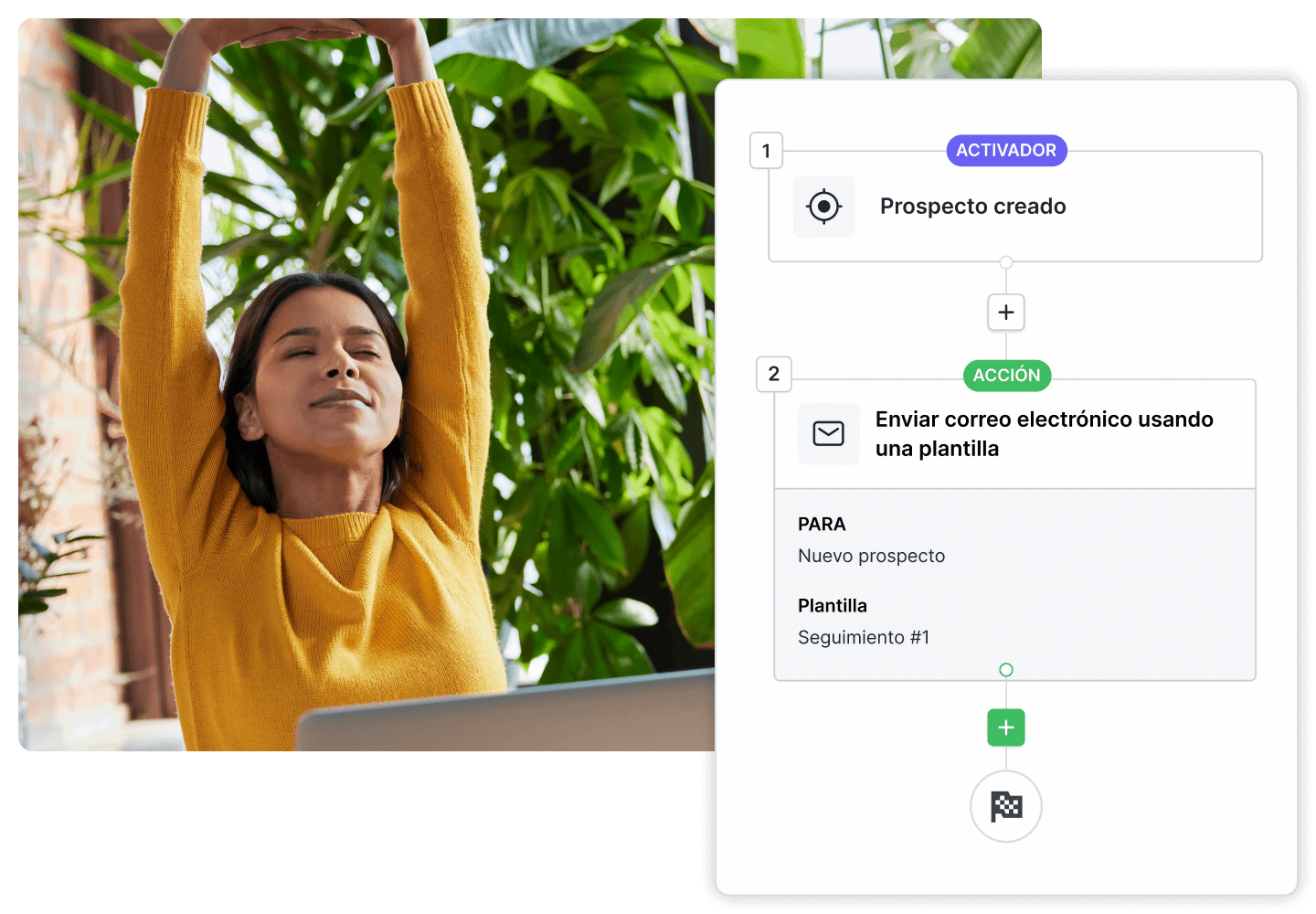 Reduce el tiempo administrativo a la mitad y permite que los representantes se concentren en cerrar tratos. Configura fácilmente las automatizaciones de flujo de trabajo para tu equipo o elige entre plantillas listas para usar.