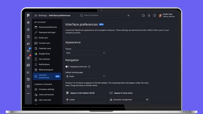 Turn on the dark theme in Pipedrive for a new, low-brightness CRM experience. This CRM dark theme can be turned on to reduce brightness levels.